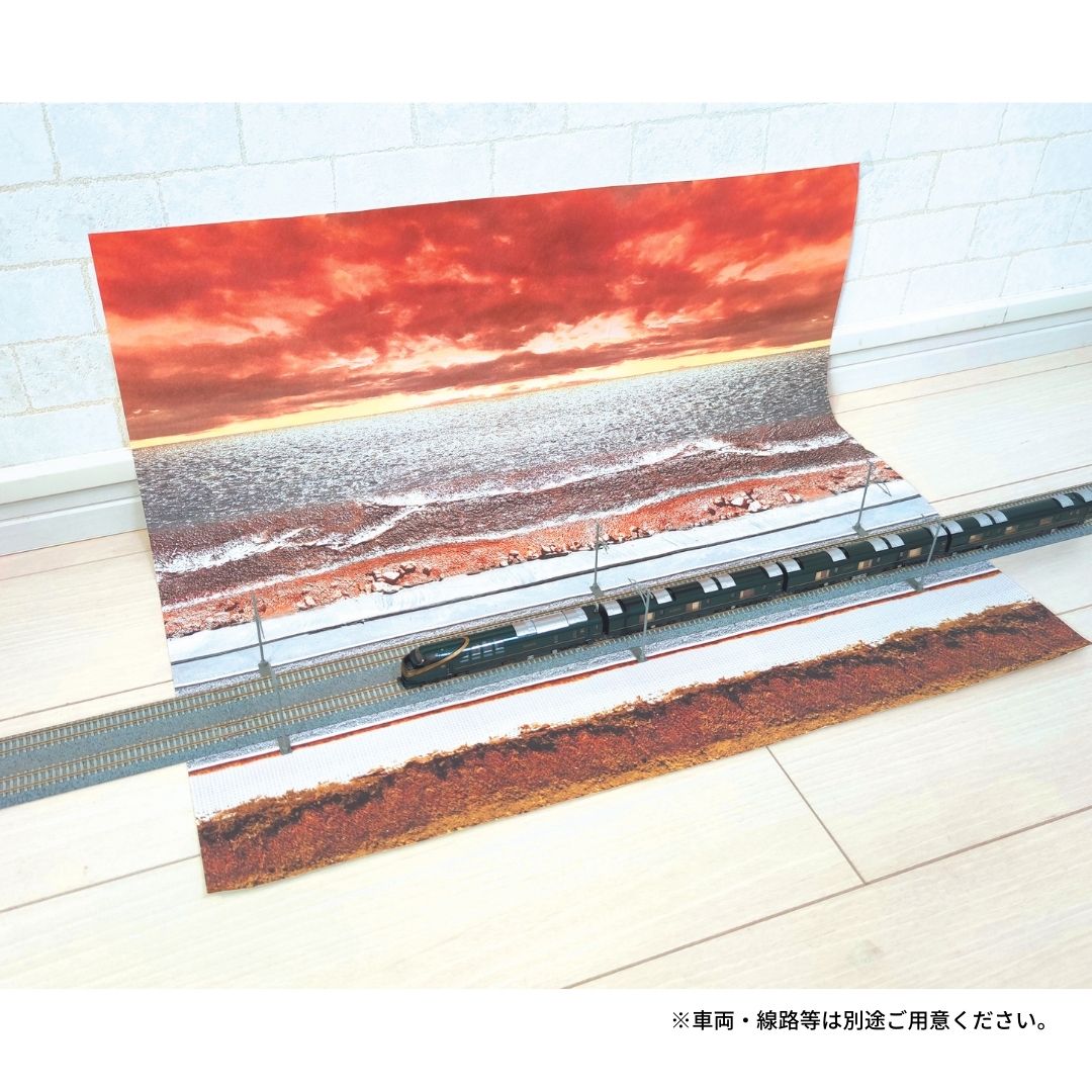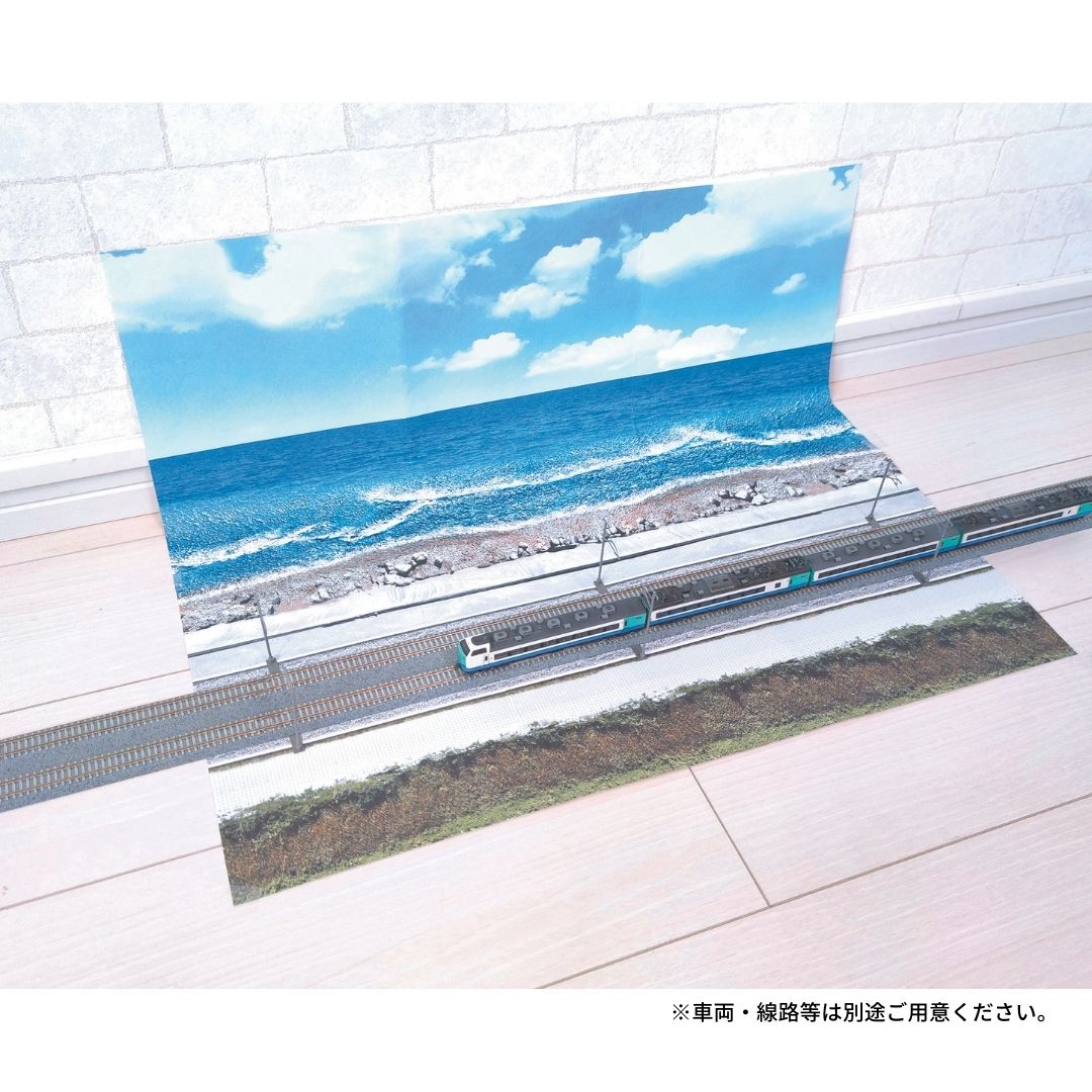 本セットは、海岸沿いを走る鉄道シーンがテーマで、表面は日中、裏面は夕景の海岸風景となっています。