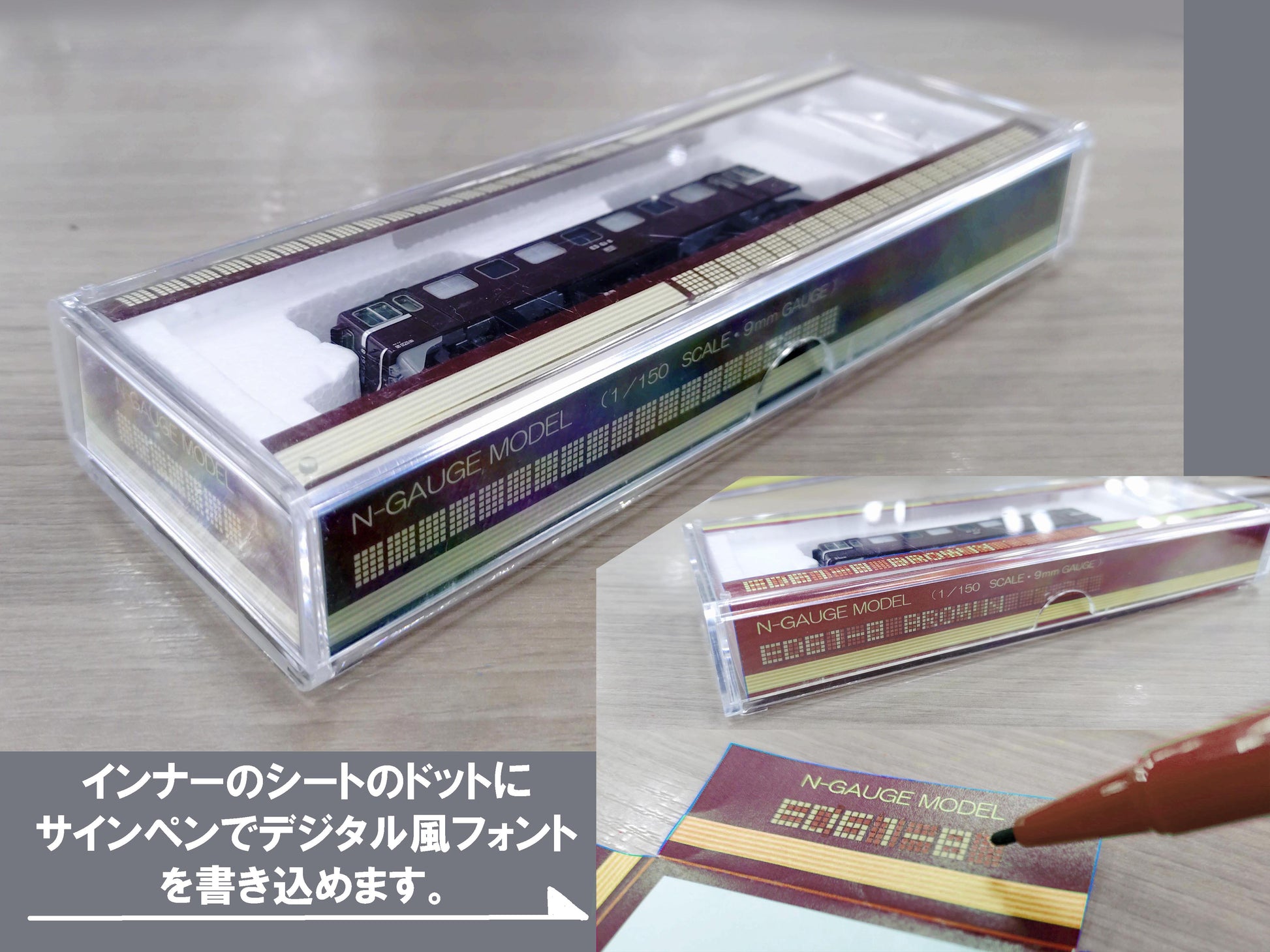 シートのドットを赤または茶色のサインペンで塗れば、デジタル風の番号や英字で、中に入れる車両形式や名称を書き込めます。