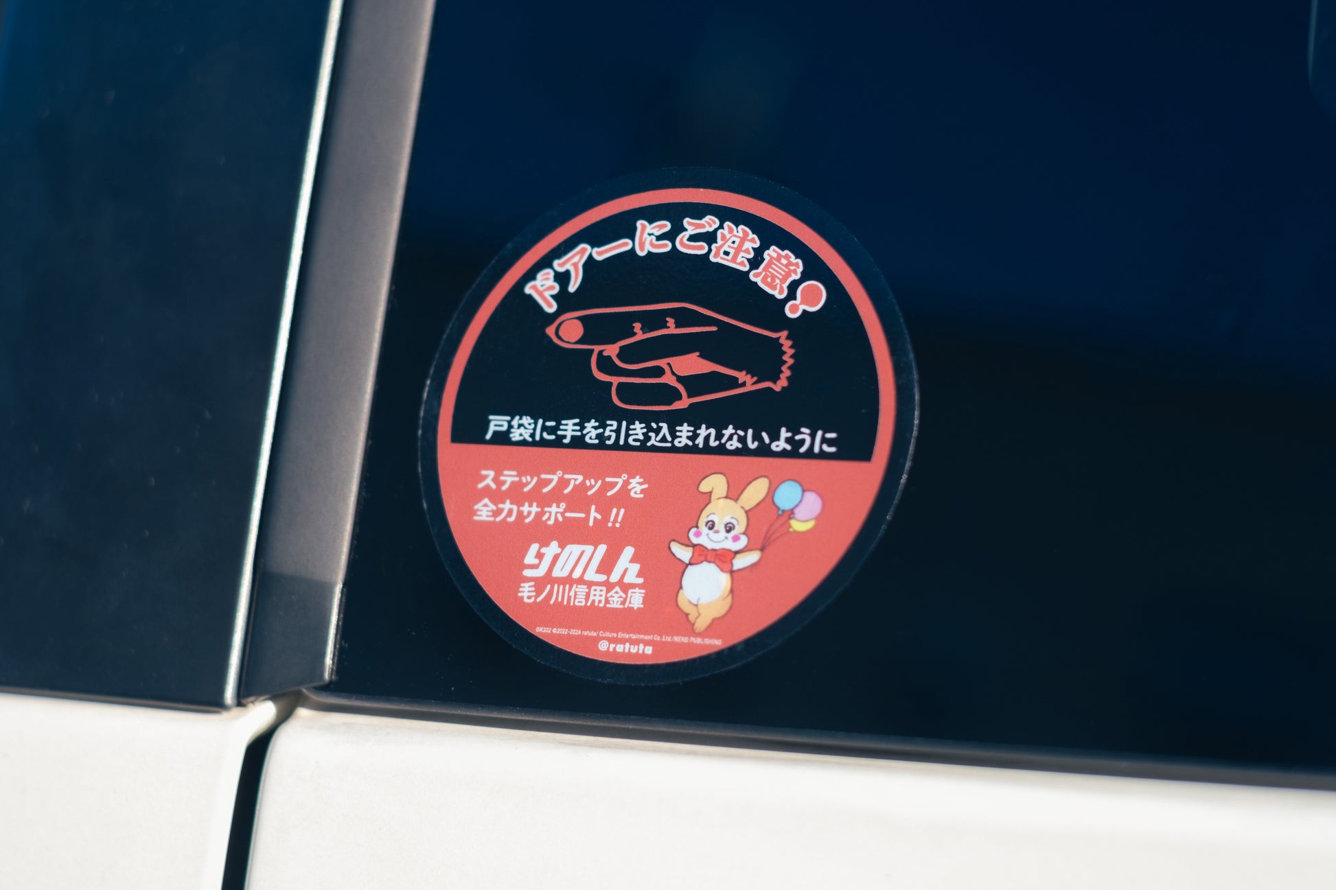 毛央鉄道の車両のドア窓に貼られているドア注意ステッカーをグッズ化しました!懐かしい円形タイプで、沿線のメインバンク「けのしん」の広告が印刷されています。各所に貼りやすいサイズに縮小して忠実に再現しています。スマホカバーやクルマの窓に貼ってみてはいかがでしょうか?