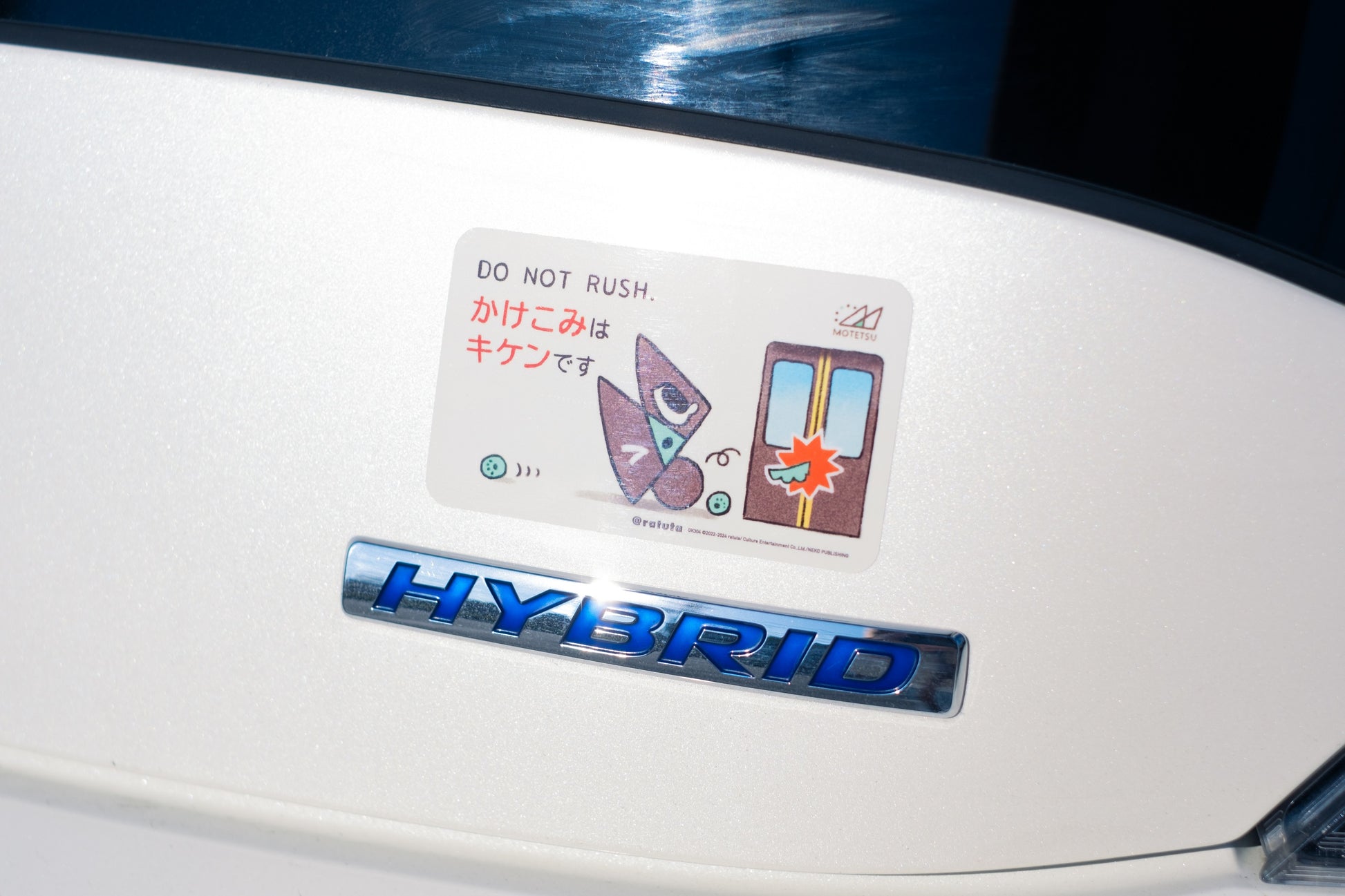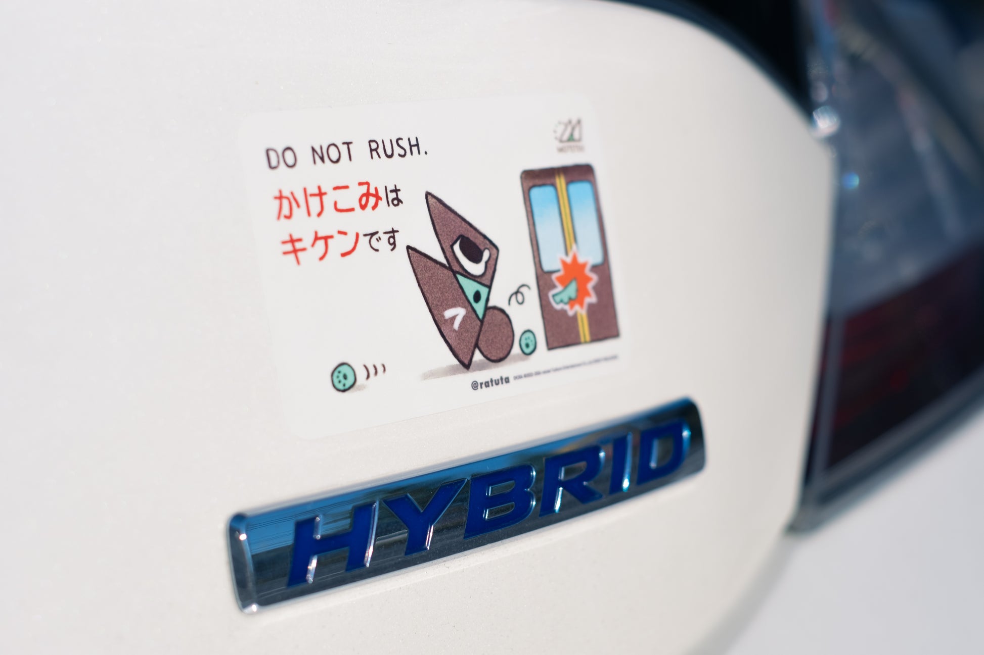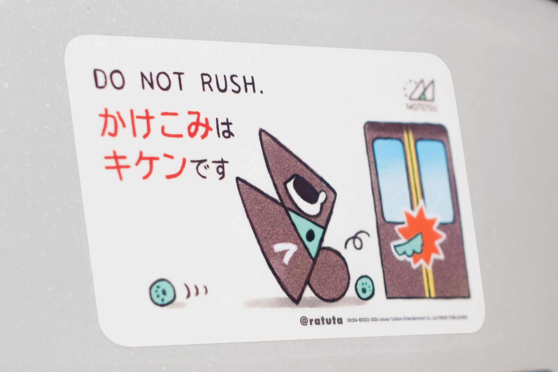 毛央鉄道の車両のドア窓に貼られているドア注意ステッカーをグッズ化しました!現行の角形タイプで、「かけこみはキケンです」とちょっと痛々しいイラストが印象的です。各所に貼りやすいサイズに縮小して忠実に再現しています。スマホカバーやクルマの窓に貼ってみてはいかがでしょうか?
